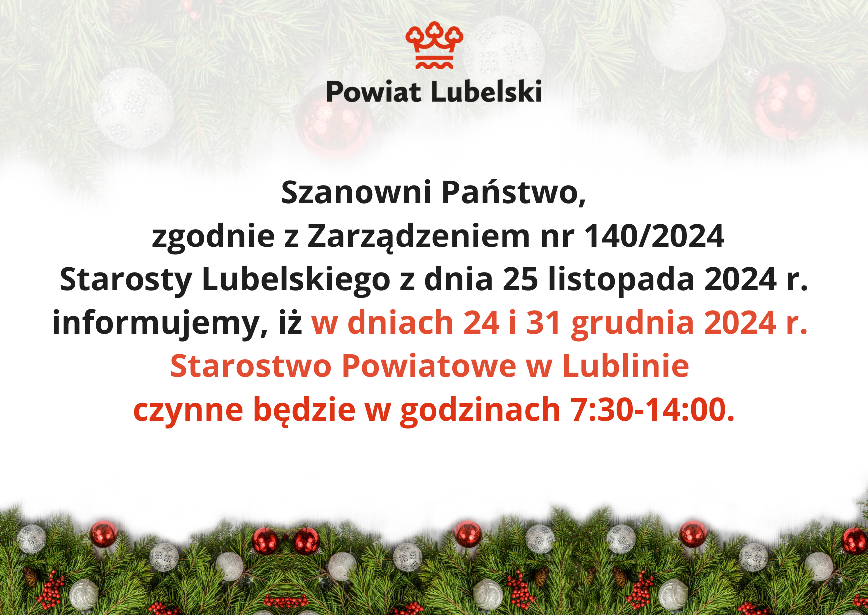 § 1. W dniach 24 i 31 grudnia 2024 r. Starostwo Powiatowe w Lublinie czynne będzie w godzinach 7:30-14:00.